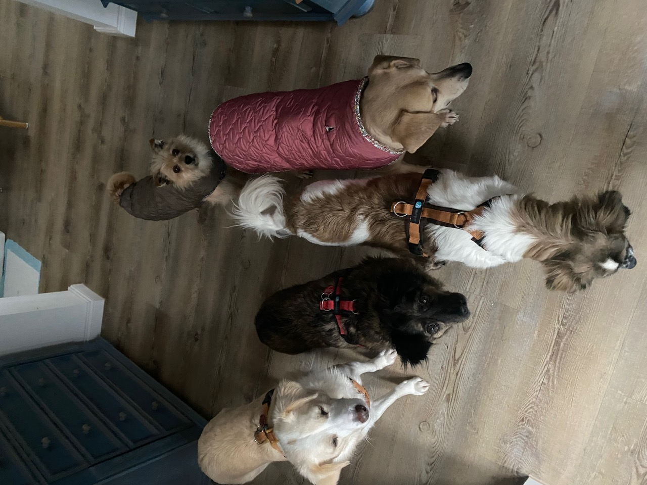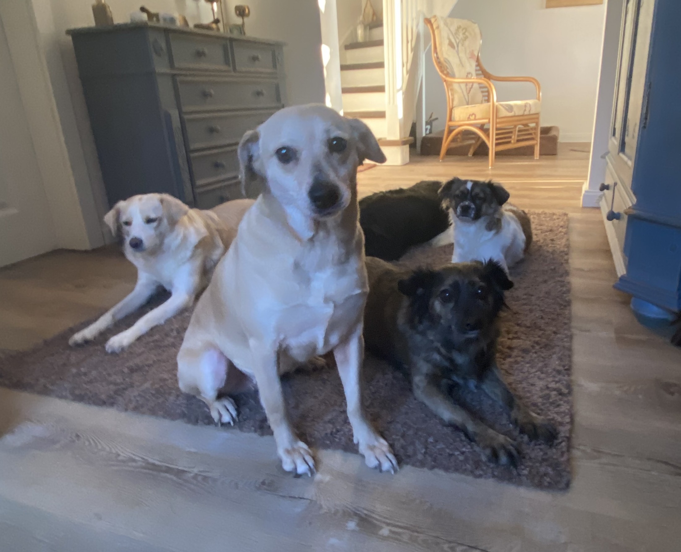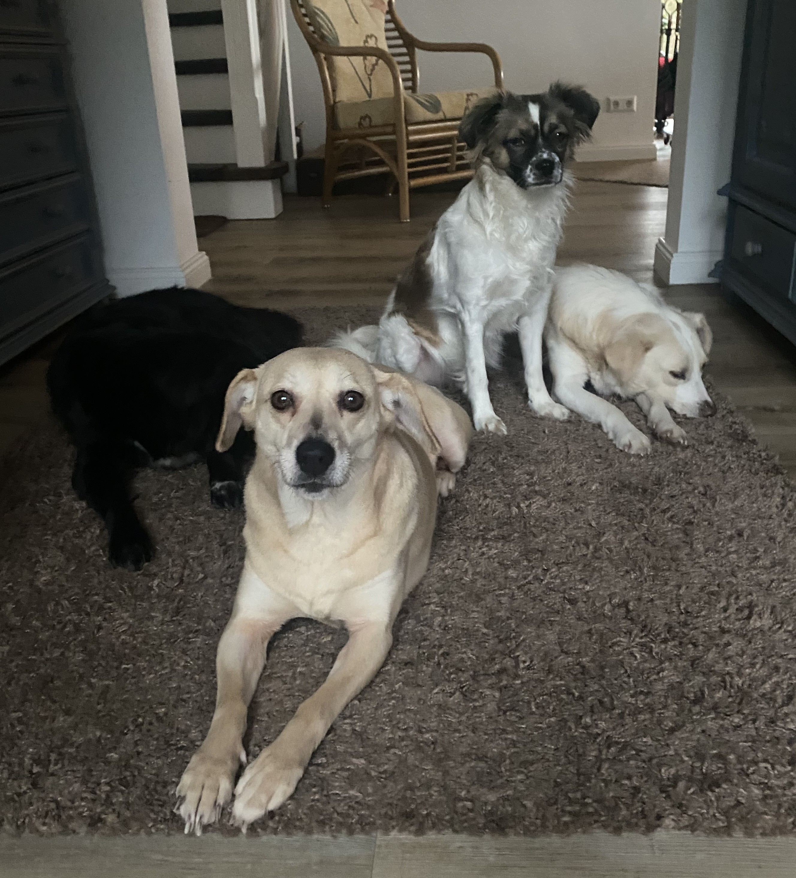 Auf meiner Pflegestelle lebe ich mit 3 anderen Hunden zusammen, und es kommen oft noch tage- oder stundenweise Besuchshunde dazu. Ich verstehe mich mit allen Artgenossen, unabhängig von deren Geschlecht und Status, gut. Auch auf den Spaziergängen verlaufen Begegnungen mit anderen Hunden harmonisch. Da ich von meinem Wesen her schüchtern und zurückhaltend bin, brauche ich Zeit, mich zu öffnen und tobe auch noch nicht mit den anderen herum. Ich spüre aber die Sehnsucht in mir und beginne, mit ihnen zu rennen. Es fühlt sich leicht und frei an, und ich genieße diese Momente. Irgendwann werde ich sicherlich auch mit ihnen spielen.